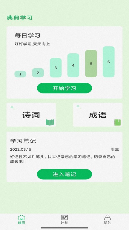 典典学习是一款成语学习软件,在应用里面可以学习诗词和成语,并附有笔记功能,在学习知识的同时可以记笔记,并且可以在课后时间进行复习。