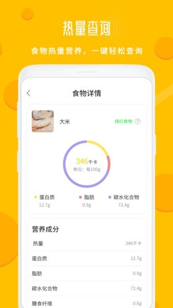 我们根据食物的分类为您制作了热量表,每个食物都可查看它的热量、蛋白质、脂肪、碳水化合物等等超全的介绍,为您提示是否为绿灯、黄灯、红灯食物,为您的减肥之旅保驾护航!