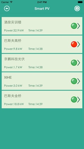 通过app可以查看电站的发电量,设备的发电功率,数据刷新时间,运行状况等实时数据,云架构的设计保证了数据刷新的及时性和精确性。