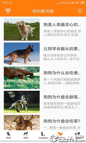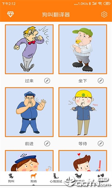 狗叫翻译器app,提供了狗叫、狗哨、心情测试、狗狗常识四个板块,让你全方面了解狗狗的每一个叫声,每一个动作,掌握狗狗心情并与它愉快玩耍其实也不难。