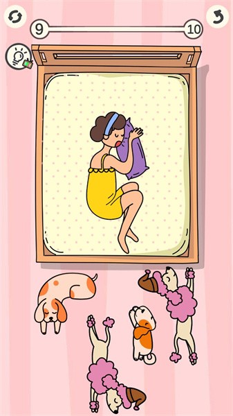 1、随着游戏关卡的完整深入,各种造型各异的狗狗在的床下自由放松的睡着,画面是非常的有趣;