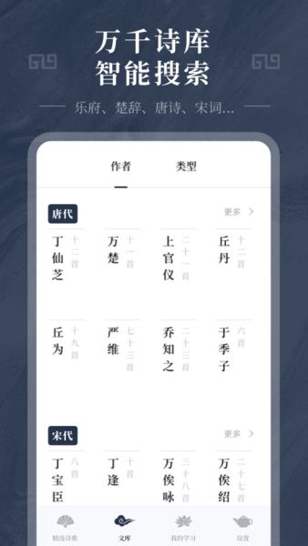 支持按作者、诗歌名称、关键词、完整诗句检索,查找更方便