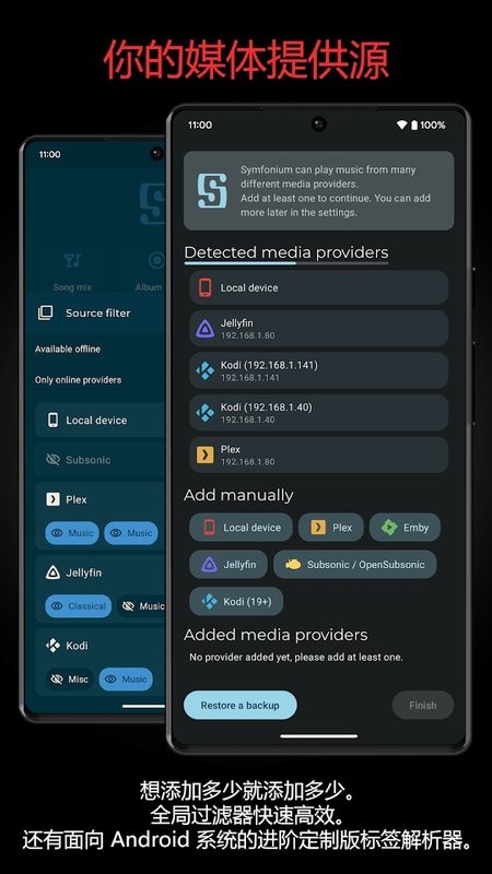 1、汇聚您不同媒体源的所有音乐(您的 Android 设备、Plex、Emby、Jellyfin、Subsonic、Kodi)于一处,交互流畅、精美且直观。