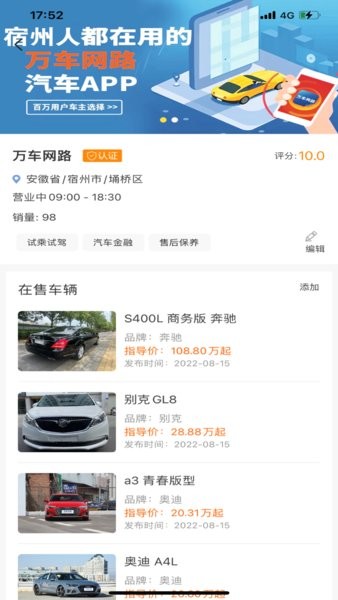 本地化定位,万车网路汽车APP,汽车门店车源展示,个人用户发布卖车,快速查看本地4S门店,二手车商等在售车源,更快获取商家信息,帮助用户在同城找到满意的商家与车源信息。