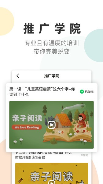 带你蜕变:凯阅平台内开设推广学院,将会带领你从绘本知识到营销推广,构建你全方位的知识体系。