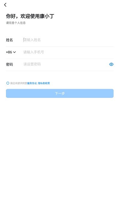 2.输入姓名、手机号、密码“下一步”。