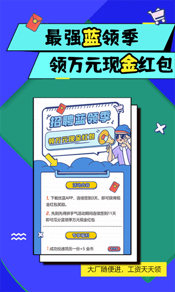 优蓝招聘app是一款全新的手机招聘软件,功能强大,种类丰富。不管你是想找工厂普工、技工,还是快递员、客服等岗位,这里都能满足你的需求。最棒的是,它还提供了一对一的职业顾问服务,帮你快速找到合适的工作。