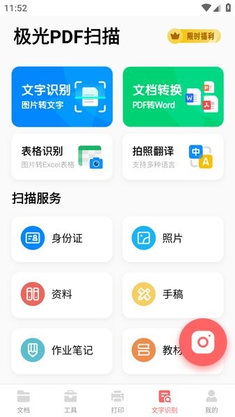 极光pdf扫描软件是一款功能强大的办公工具,支持文档扫描、文档打印、,表格识别、拍照翻译等功能,支持不同格式文件扫描,还具备pdf转其他,其他转pdf,操作简单又快捷,极大提高效率,可以适用用于不同的办公学习场景!