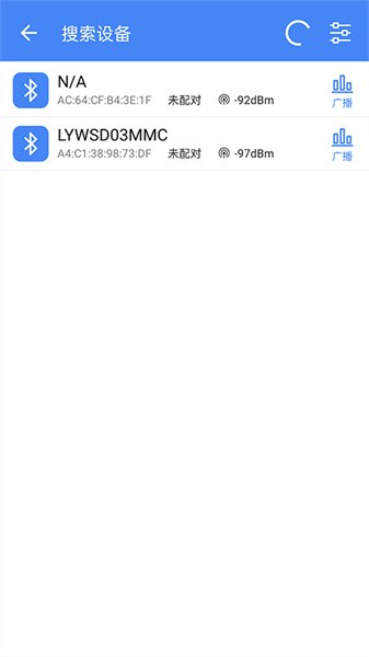- 支持搜索周期、循环搜索设置,实时显示搜索到的设备信息(信号强度、MAC地址、配对及连接状态、广播数据等)。