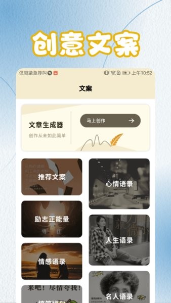 菜鸟写作工具app里面有非常丰富的文案资源,帮助用户快速生成文章,这里有各种实用的语录资源,帮助用户快速搞定一篇文章,让写作文不再难,还有趣味的文章生成器哦,创作就是这么简单,人人都是作家。
