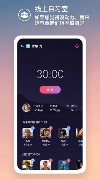 还有一个特别棒的功能是“线上自习室”,你可以根据自己的喜好添加自习室,和同学们一起互相监督学习。每次看到排行榜上别人也在努力,自己就更有动力了,完全没理由偷懒。