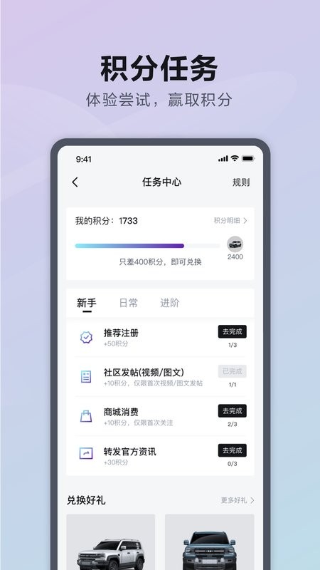 方程豹汽车官方版是一款由比亚迪推出的新能源汽车品牌应用,旨在满足用户的个性化需求。它不仅提供丰富的车型选择,还支持预约试驾、视频直播和定制服务等功能,让用户可以轻松了解车辆信息并参与社区互动。app内还有积分任务系统,完成任务就能兑换奖励,挺有意思的。
