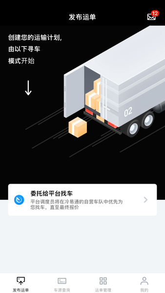 可选择委托平台找车、指定一口价找车、竞价找车三种货源信息发布方式。