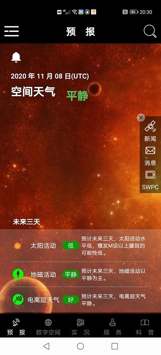 1、每天发布最及时的空间天气状态,时刻掌握最新的空间天气变化