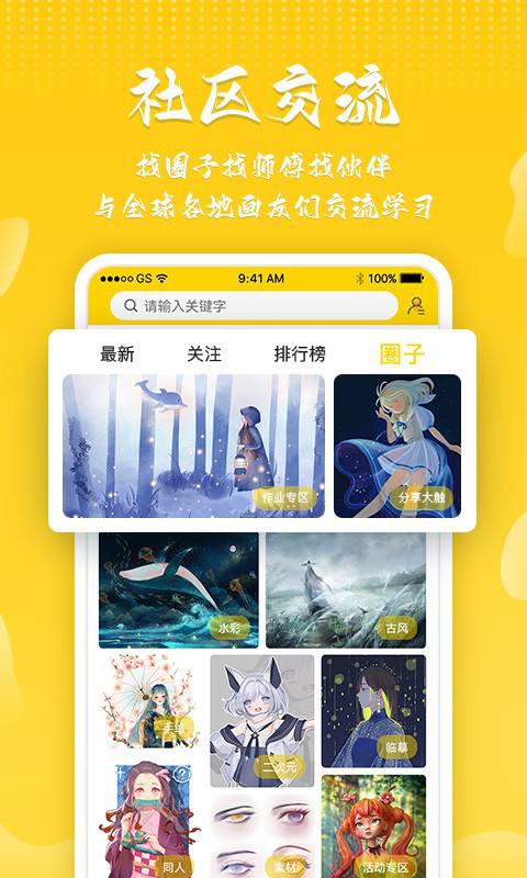 为绘画爱好者提供创作分享交流平台,用户还可以选择不同主题圈子,更精确地找到同好进行探讨学习和欣赏全球各地名画师优秀画作;