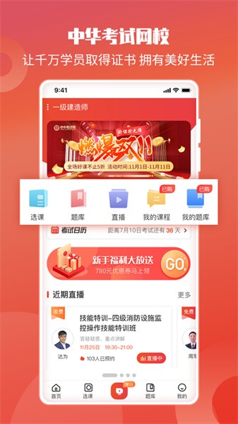 中华考试网app是非常好用的一款职业技能学习手机软件,在这里用户们能够看到非常多不同行业的学习课程进行学习,各种专业的课程在这里全都能够找到,让用户们能够自由的进行选择,超级的好用。