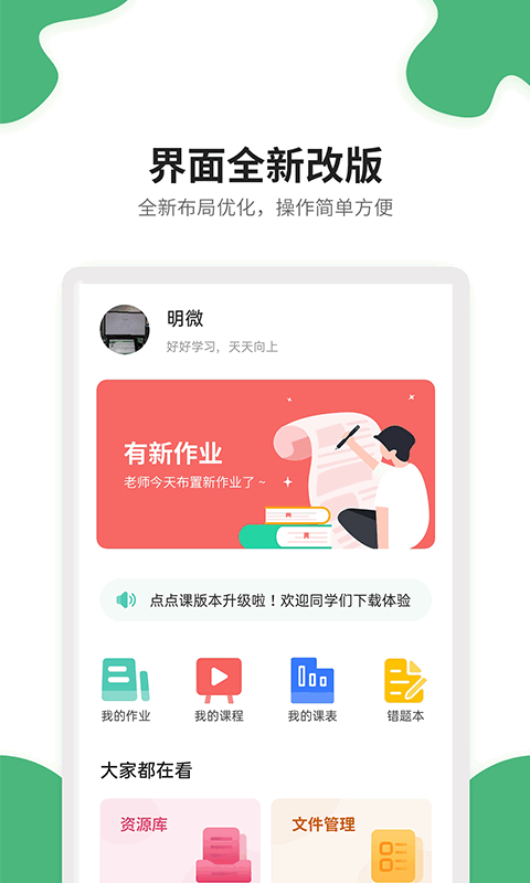 点点课学生版是适合学生使用的在线学习平台,提供我的作业、我的课程、我的课表、错题本等服务内容,还有精品小课老师教学指导,带来精准作业练习题库,帮助学生复习巩固,查漏补缺,全面掌握知识,不断进步,一键分享,好用又实用!
