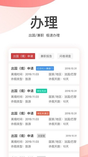出国(境)申请、兼职报告、问卷调查。使线下事务办理通过线上办理即可实现,满足多种事项的申请和办理工作,极大地满足了老干部的办事需求,同时有效提升了工作效率。