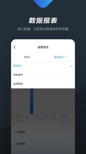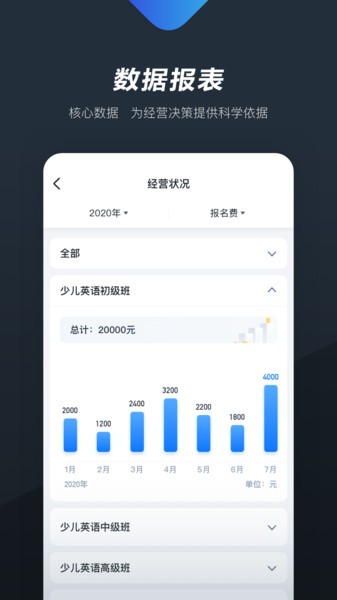 3、根据机构内的招生、上课、财务等情况为我们生成各种报表,让我们随时了解机构的运行状态。