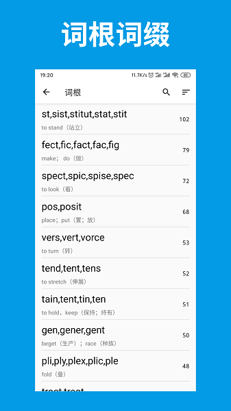 词单单词,采用词根词缀等英语基础构词方法进行深度记忆,帮助用户很好的完成单词的记忆工作,各种科学的记忆方法,帮助用户加深对单词的理解与记忆深度,确保学习的有效性,有需要的用户可以下载使用!