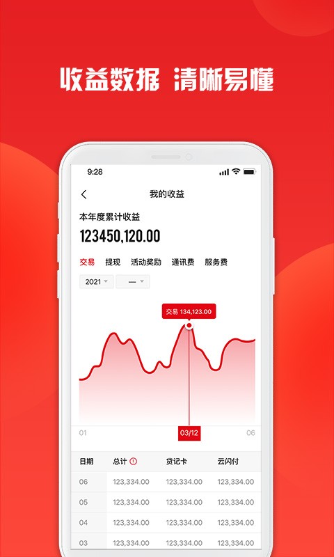 2、收益统计,每个商户得到的日常收益都会进行统计,将数据清晰易懂展示给你。