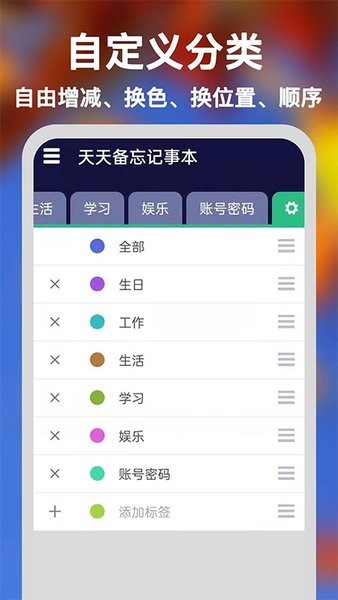天天备忘记事本是您可以随时随地打开记录身边美好事物的移动软件。无论你是记账、记录、记事、记手账、备忘提醒、待办事项、写日记、购物清单、记录生日、情侣纪念日、学习笔记、读书笔记、便签,还是灵感来了要写脑洞,或是想写长微文、长微博等等,都可以随手记录在天天备忘记事本上。