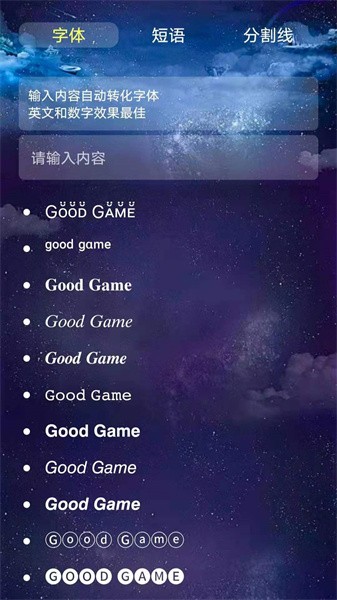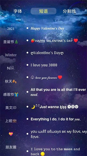 各种好看的字体符号都能够自由的去选择,可以将网名,句子等迅速生成。