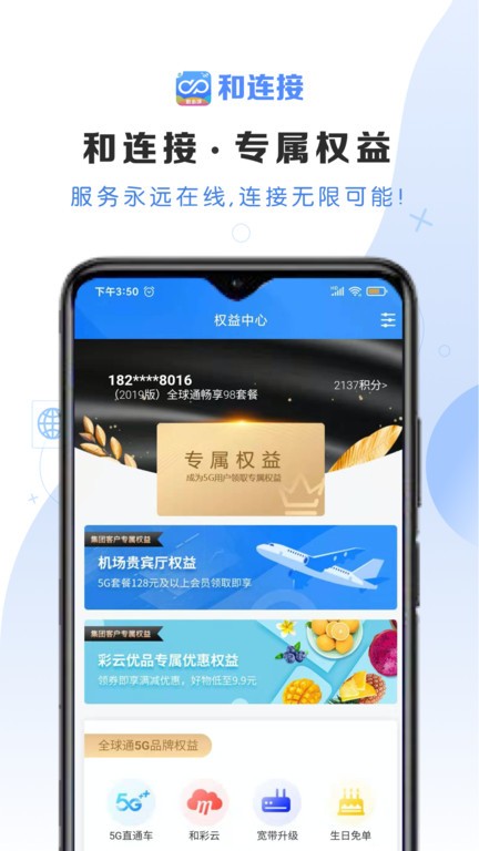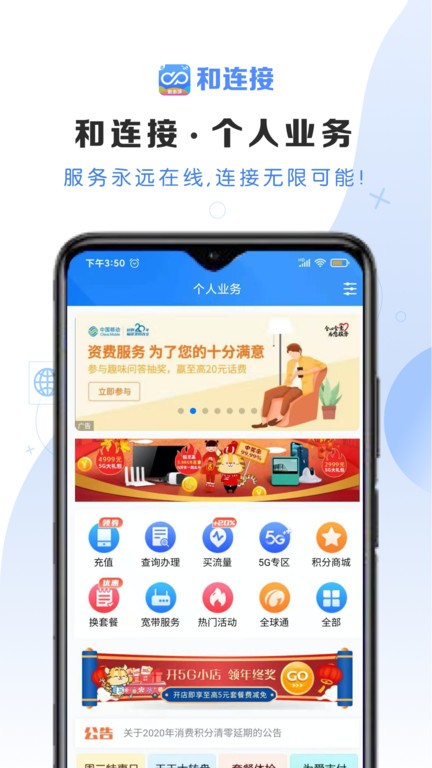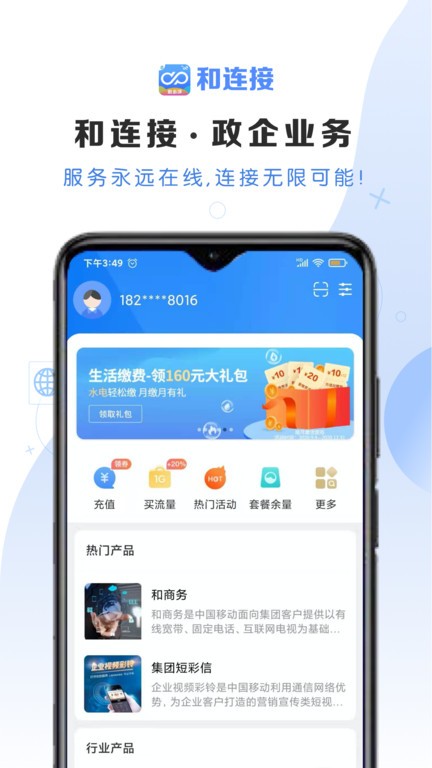 和连接app是由云南移动专为企业用户打造的移动服务软件,可以便捷的进行生活缴费,支持在线充话费和购买流量,这里有非常丰富的套餐可以选择,能够查看套餐里面剩余的流量,还可以了解最新的优惠活动。