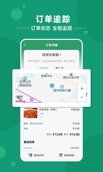 3、只需要在手机上一键下单,订购附近的美食,马上就有专业的骑手为大家配送到家。