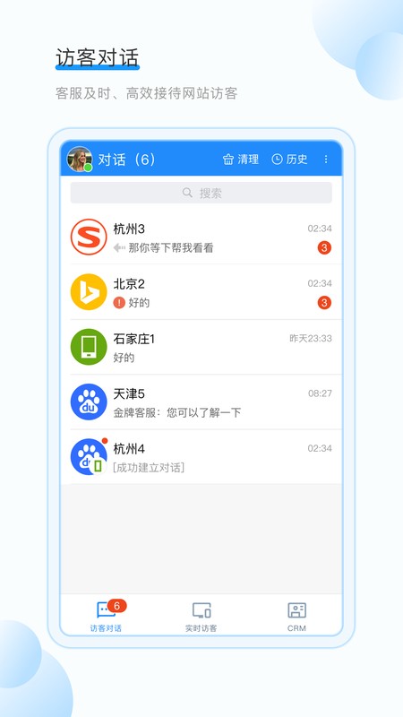 掌上客服app现已改名为53客服手机版,是专门提供客服沟通管理的办公性软件,支持实时访客、crm,访客及时,高效接待访客,对正在浏览网站访客主动发起会话,对留下线索的访客进行实时跟踪管理,极大提高工作效率,操作简单便捷!