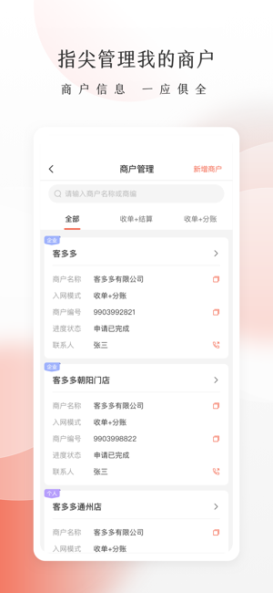 -- 提供商户查询、新增、签约等多种管理功能,实时掌握商户状态