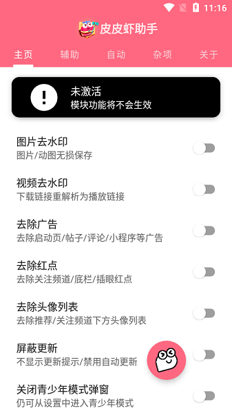 皮皮虾助手app官方版是好用的皮皮虾助手工具,功能内容丰富多样,体积小巧,支持图片、视频去水印、去除广告等功能,还提供自动切换、自动点赞、解锁屏蔽词、消息99+等功能,激活登录即可使用,操作简单易上手,方便又实用!
