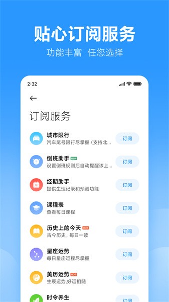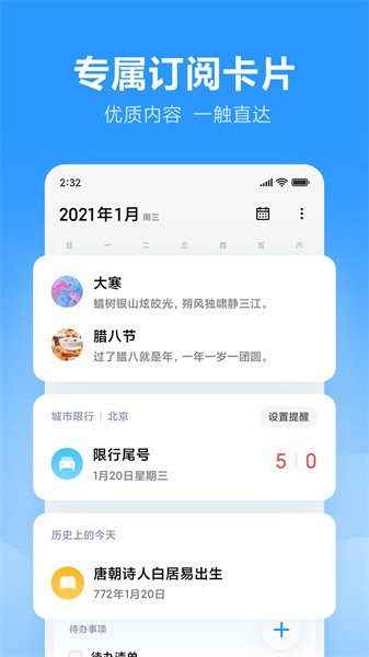 小米日历是手机日历类软件,这是一个非常好用的日历软件,在这里不仅使每个人都可以更方便地查询和安排日历,还提供了诸如节气和倒数日等功能。它非常方便和完整,并且该软件还可以通过平板电脑日历的在线更新更好地解决问题。多种用途可以满足每个人的日常使用需求,也可以提高效率。喜欢的快来下载吧!