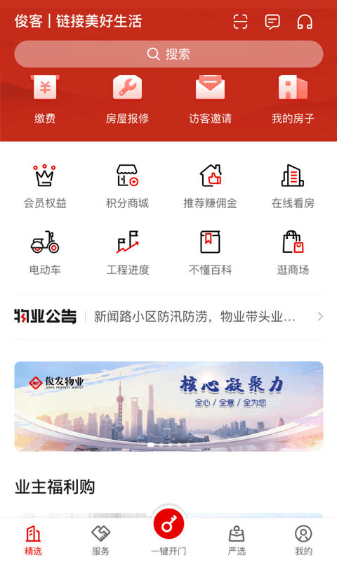 俊客软件是一款提供便民生活服务的应用app,集看房、商城、缴费、报修等功能内容为一体,实时更新推送物业公告,工程进度一手掌握,及时查看,支持一键开门,各种商品自由选购,更有会员权益福利享受,值得推荐体验!