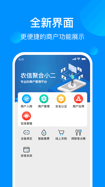 农信聚合小二官方版是农村信用社旗下的商户入网管理办公平台,功能内容丰富,使用方便简单。集商户入网、账户管理、实名认证、商户应用等服务为一体,支持设备绑定、智能缴费,还有收银系统等你体验使用,满足商户的需求!
