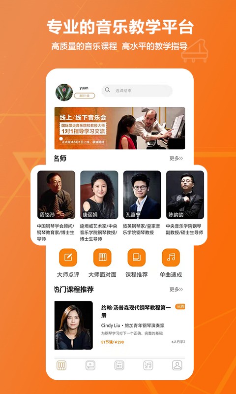 线上录播课程从兴趣考级、单曲演奏学习到专业课程进阶满足大家多种学习需求,线下大师班满足钢琴演奏进阶学习。