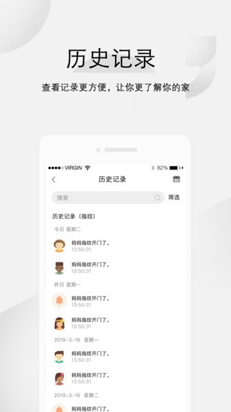 通过手机APP端,对门锁三种帐号(指纹、密码、感应卡)的归类管理,可以实现身份识别。从而可以实现刷特殊指纹报警、轻松掌握孩子放学后回家时间、场景应用时实现个性化联动。