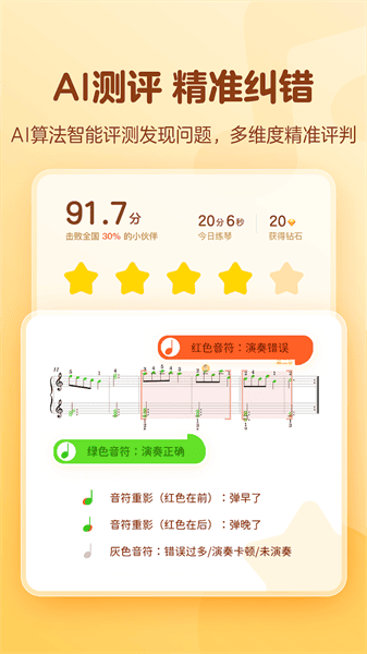 还有一个AI测评功能,可以多维度评分,找出你演奏中的问题,还能和全国的琴童比拼,挺有动力的。软件还设计了很多闯关挑战,让学习变得更有趣。总的来说,这个App对钢琴爱好者来说是个不错的选择,特别是那些想要提升演奏水平或者想自学的人来说,非常实用!