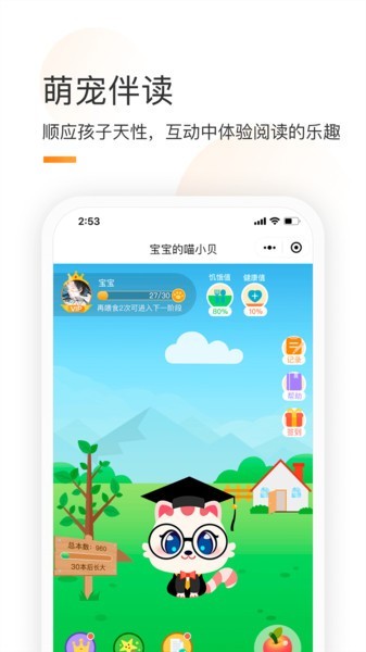 领养一只伴读萌宠,通过阅读记录促进萌宠的成长,每月获得一套新鲜的装扮和好玩的表情,顺应孩子天性,让孩子在互动中体验阅读的乐趣。