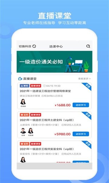 一级造价工程师题库app为想要考造价工程师的用户带来更多的学习资源,让用户更加方便的学习,还有许多的题库可以在软件之中进行练习,软件还有许多的直播课程可以进行观看。