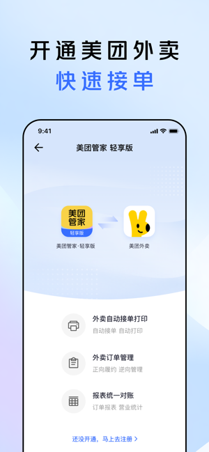 美团管家轻享版,是美团为助力小型单店商家、提升经营效率而打造的一套简单易操作的门店点餐收银管理软件,在手机上即可完成接单、打印、订单管理、菜品管理等操作。产品覆盖了扫码点餐、外卖接单、团购核销、会员储值消费等经营场景,集成了点餐模式管理、订单快捷操作、打印机小票设置、促销活动设置、数据报表、经营对账、门店信息管理等丰富功能。