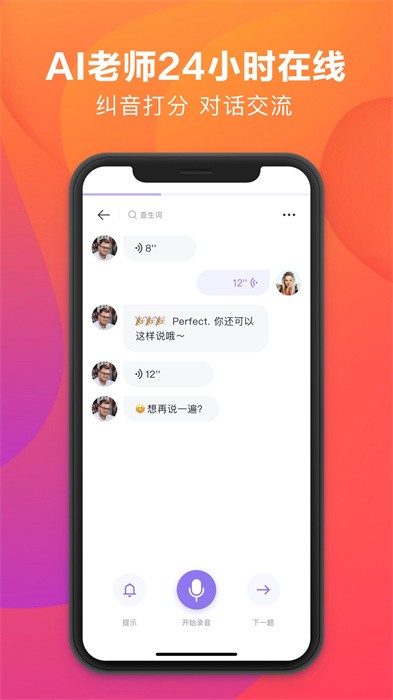 真人在线对话:根据等级匹配合适的语伴,展开英语互动对话;答题pk:连线小伙伴比拼单词量和英语知识。