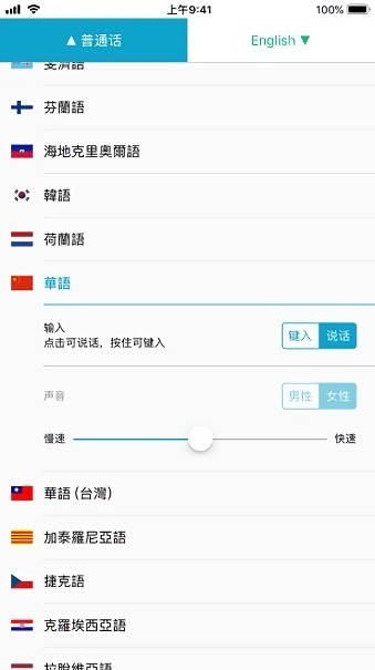 快速更改语言,选择男性或女性语音 (如果可用),并加快或降低语音速率。