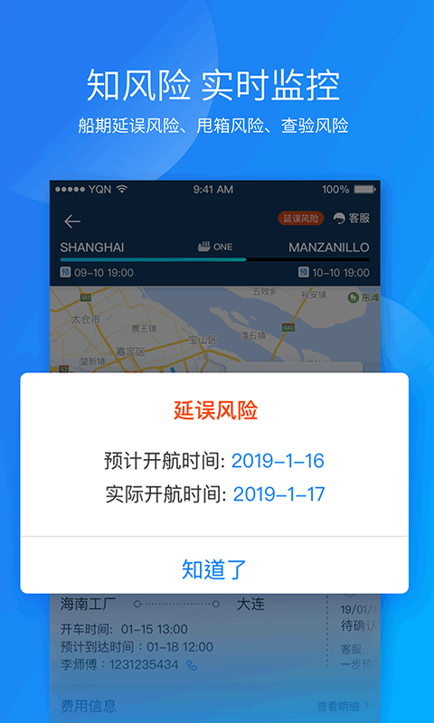 运去哪app可提供船期延误、甩箱、查验等风险的预警功能,提前制定应对策略,实现风险的可视可控。