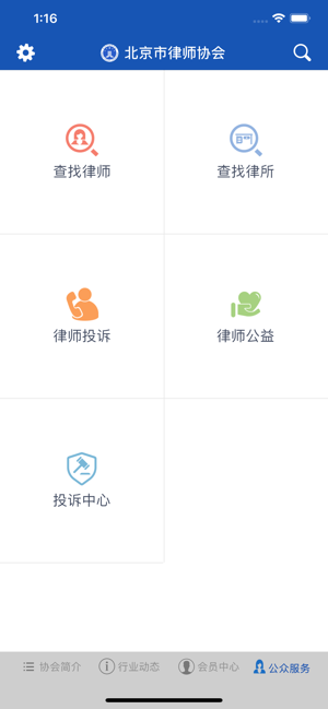 5、提供律师服务,这里为公众提供律师查找、律所查找与律师投诉等服务。