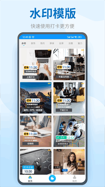 适于项目巡检、勘察取证、防控消杀、执勤执法、考勤打卡、外勤拍照、工程管理、微商电商等多场景工作拍照、打卡、记录所需,更有防疫消毒水印,记录健康。另持续推出创意水印,支持乐享生活的人们旅游打卡、探店打卡、健身打卡!