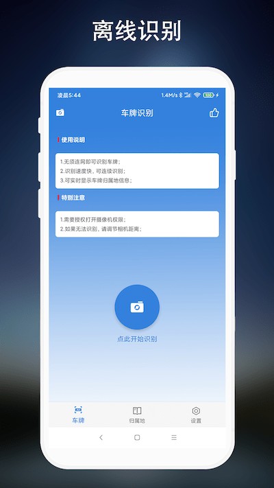 车牌识别,一款可以离线识别车牌号码的APP。内置人工智能车牌识别模块,可以在离线情况下连续识别车牌号码、显示车牌归属地、显示车牌颜色等。同时,可以使用内置知识库快速搜索车牌归属信息,也可用于无网络情况下,快速登记车牌号码等场景。