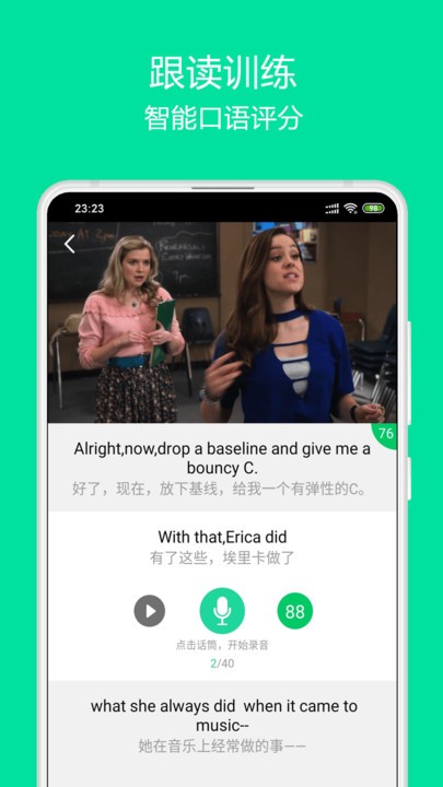 智能实时口语评分,逐句跟读逐词打分,助你攻克“开口”难关。