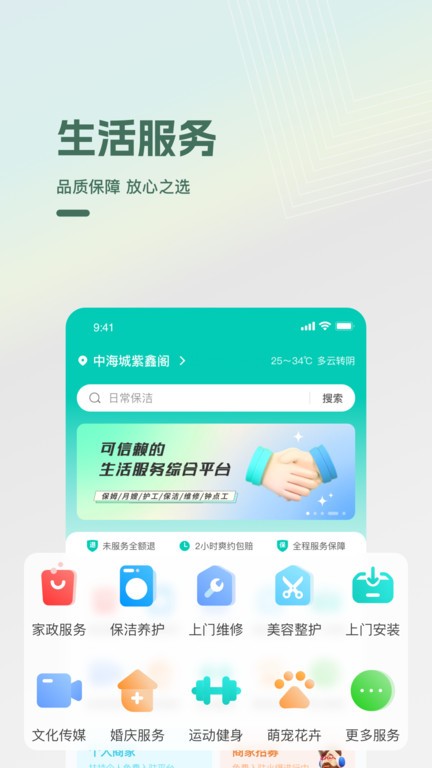 光合万家官方app打造了一站式的生活便捷服务,你想找的服务这里都有、找家政保洁、维修安装、健身运动、宠物、美容等都非常轻松,有非常详细的套餐收费价格,支持在线预约,专业人员上门服务。
