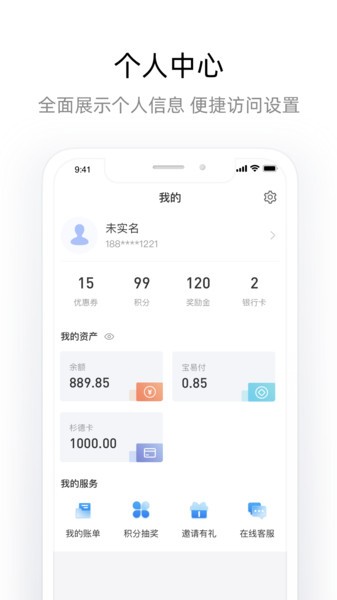 杉员Τ了提供支付、转账、收款等基础功能外,还支持预付费卡消费、积分兑换、电信移动话费等!在轻松消费的同时,还能积分兑换,让商业与生活更加便捷!